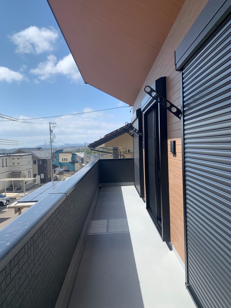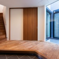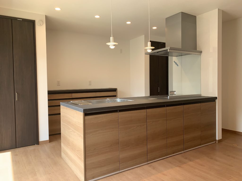 西向きの広々した敷地、思い切って西面に大きなガレージを配置。玄関の内側に設けた坪庭と大きな吹抜から、たっぷりと明るい日差しが入ります。落ち着いたトーンの木目とダークグレーのキッチンは、お家全体を大人シックな落ち着いたイメージに調和させています。